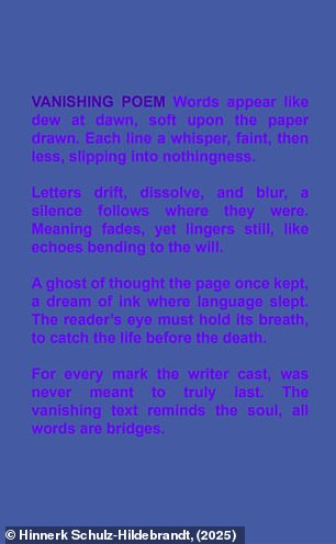 In a final version, Dr Schulz-Hildenbrandt created a ‘vanishing poem’ using text in the same purple and blue combination.