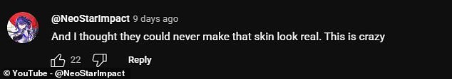 A user commented: “I believed they were incapable of making that skin appear realistic. This is astonishing.”