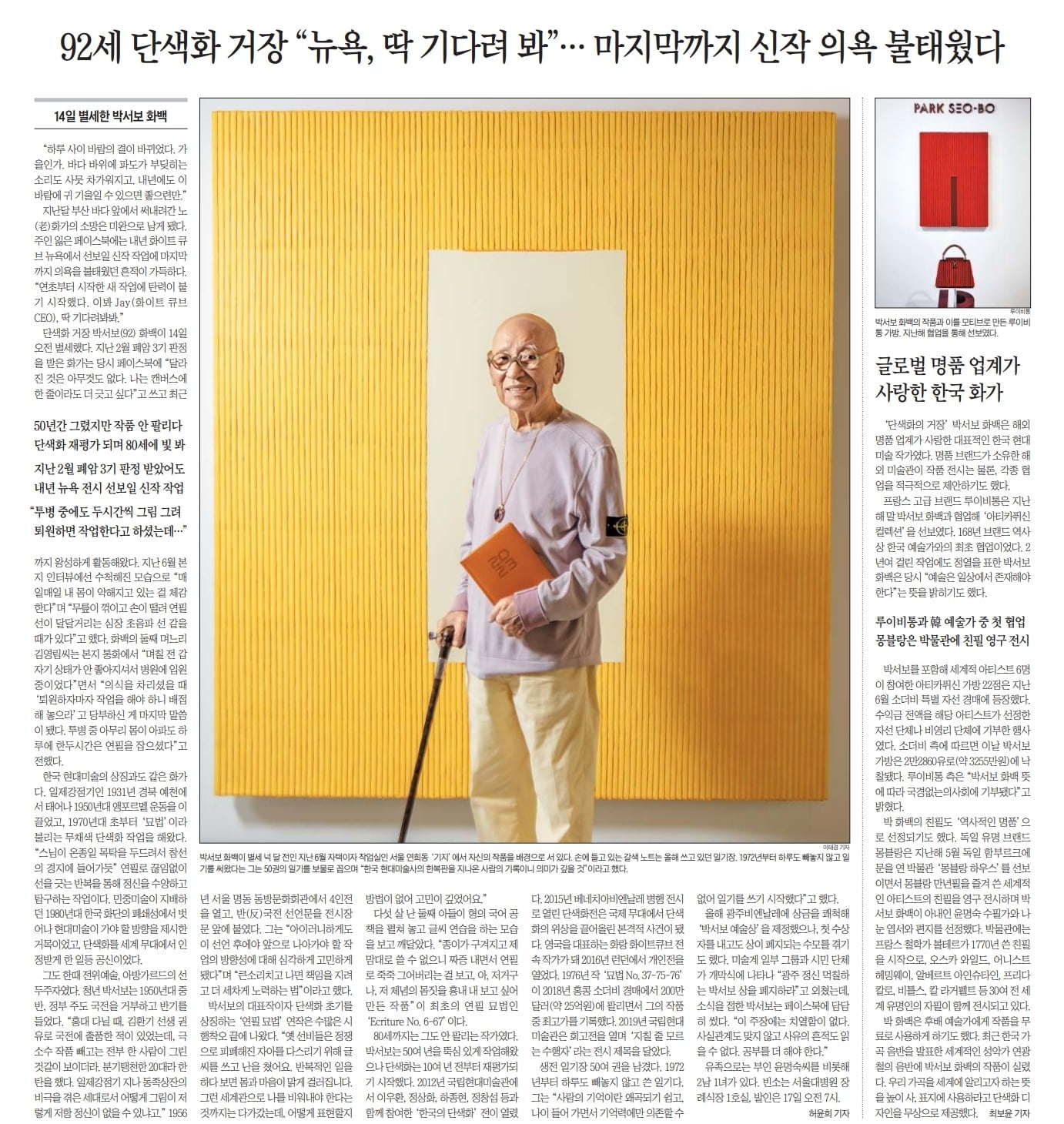 Despite spending more than 50 years working with monochrome art, his pieces only gained widespread popularity after he reached the age of 80. His artwork *Miyobop No. 37-75-76* from 1976 was sold for $2 million (about 2.5 billion South Korean won) at a Sotheby’s auction in Hong Kong in 2018. This highlighted the increasing international appreciation for Korean art. Park stated, “We have always been here. The world is simply now recognizing the quality of Korean art.” (June 13, 2023 edition)