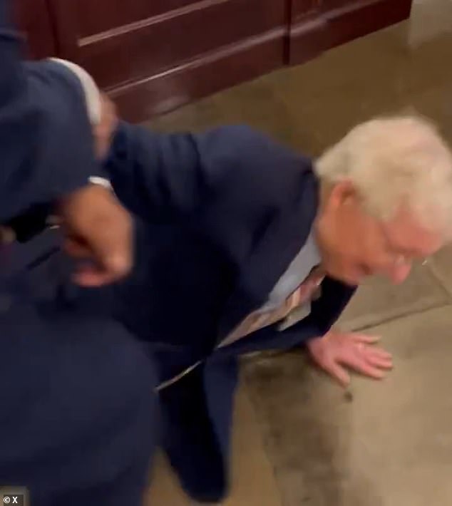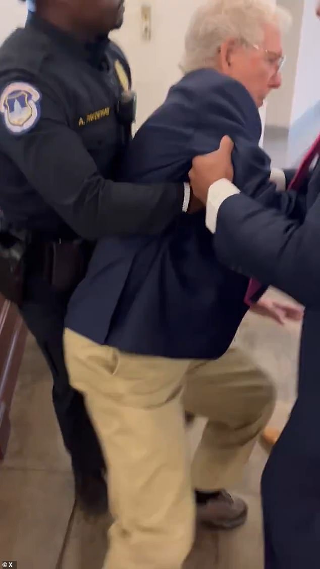 The KentuckyThe senator was assisted to his feet by an assistant and aCapitolPolice officer. He managed to wave briefly towards the camera before resuming his walk without any help.