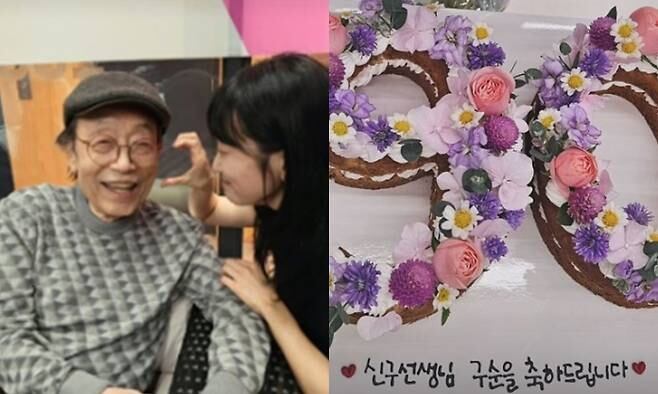 Actor Kim Seul-gi, 35, shared an image with Shin Goo on her Instagram on the 16th of last month, accompanied by the message, “Happy 90th birthday, Teacher Shin Goo.” The two stood together with a cake shaped like the number “90,” making a hand heart and beaming with smiles.