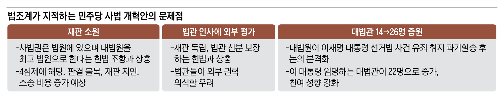 The Democratic Party’s plan to incorporate evaluations of judges from local bar associations into judicial reviews has faced backlash over possible unconstitutional aspects. Professor Jang Young-soo from Korea University stated, “Judges might struggle to make impartial decisions because of pressure from lawyers, who can be seen as involved parties in court cases, concerning their employment issues.” This could violate Article 103 of the Constitution, which ensures judicial independence.