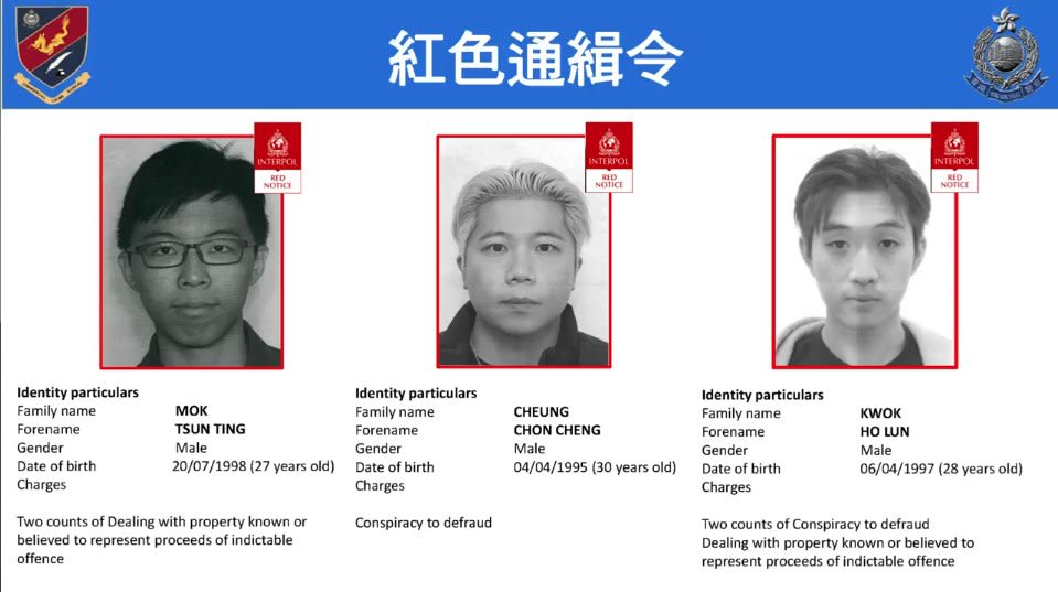 On Wednesday, the police stated that Interpol has issued a Red Notice for three men suspected of being central figures in the JPEX case who have left the city: 27-year-old Mok Tsun-ting, 30-year-old Cheung Chon-cheng, and 28-year-old Kwok Ho-lun.