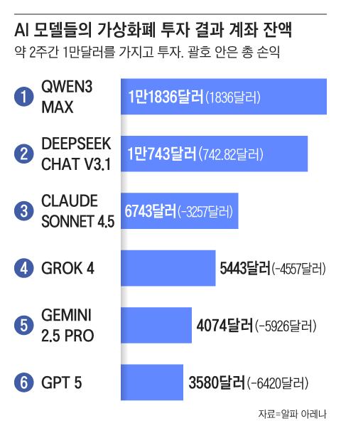 In the initial test, which ended on the 3rd, Alibaba’s ‘Qwen3-Max’ recorded a 22.32% return rate, placing it at the top. DeepSeek’s ‘Chat V3.1’ came next with a 4.89% return. Meanwhile, top American AI models struggled. Anthropic’s Claude Sonnet 4.5 dropped by -30.81%, xAI’s Grok 4 fell by -45.3%, Google’s Gemini 2.5 Pro declined by -56.71%, and GPT-5 had the worst result at -62.66%.