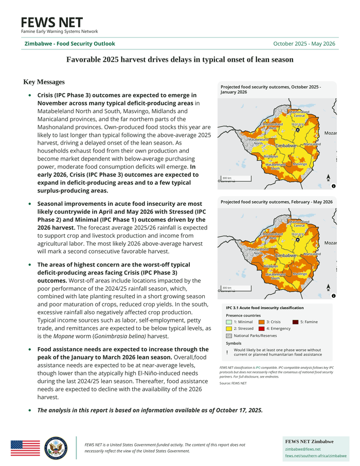- Crisis (IPC Phase 3) situations are anticipated to develop in November in numerous regions that usually experience shortagesIn the provinces of Matabeleland North and South, Masvingo, Midlands, and Manicaland, as well as the northernmost areas of the Mashonaland provinces, this year’s home-grown food supplies are expected to last longer than usual due to the above-average harvest in 2025, resulting in a later start to the lean season. As families use up their own produce and become reliant on the market with reduced buying capacity, moderate food consumption gaps will begin to appear.In early 2026, it is anticipated that Crisis (IPC Phase 3) situations will spread in regions that typically experience shortages and also affect some areas that usually produce surpluses.