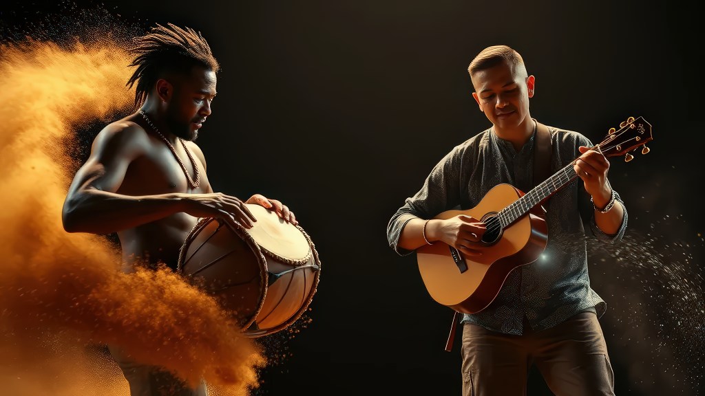Imagine the soft rhythm of rain falling outside an old wooden house… the echo of a bamboo flute blending with the beat of distant drums… and two voices — one Indonesian, one African — singing together about hope and togetherness.