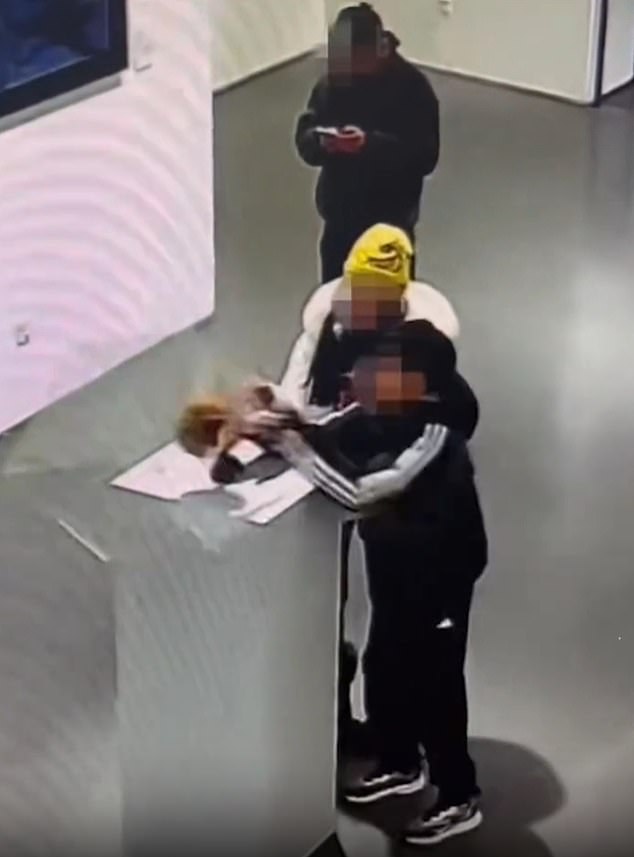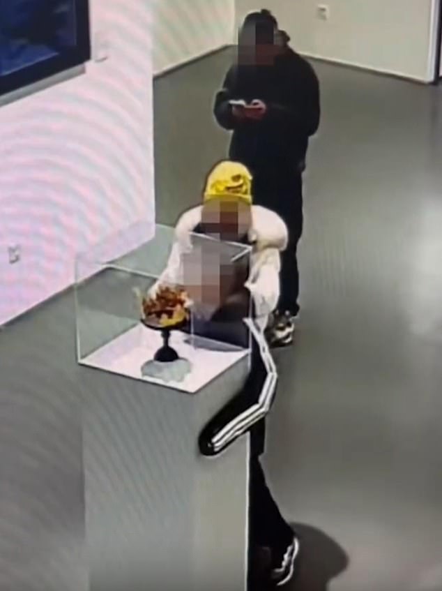 This is the instant a child accidentally knocked a hand-made golden wedding crown from its showcase, causing it to fall to the ground during a free public display.