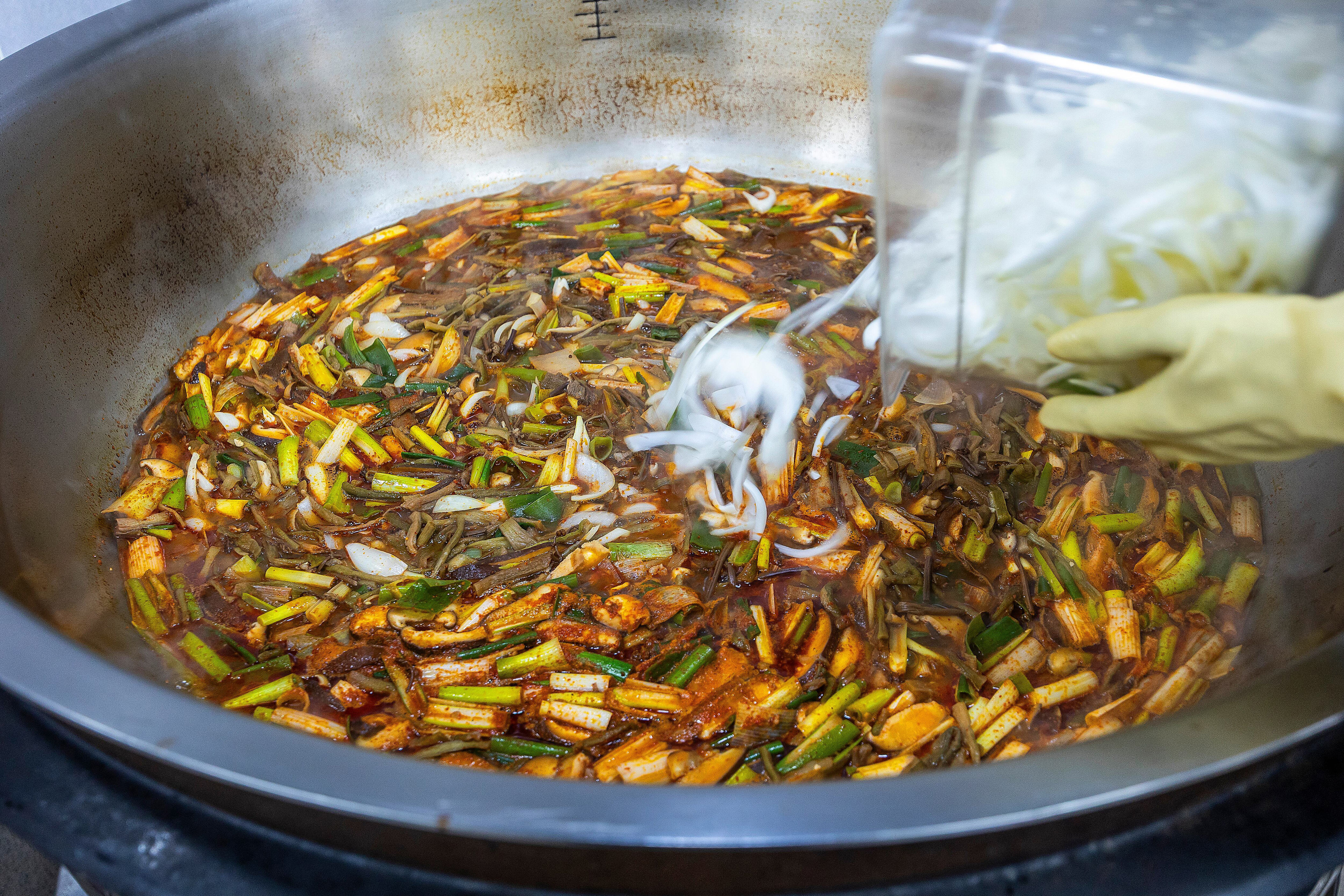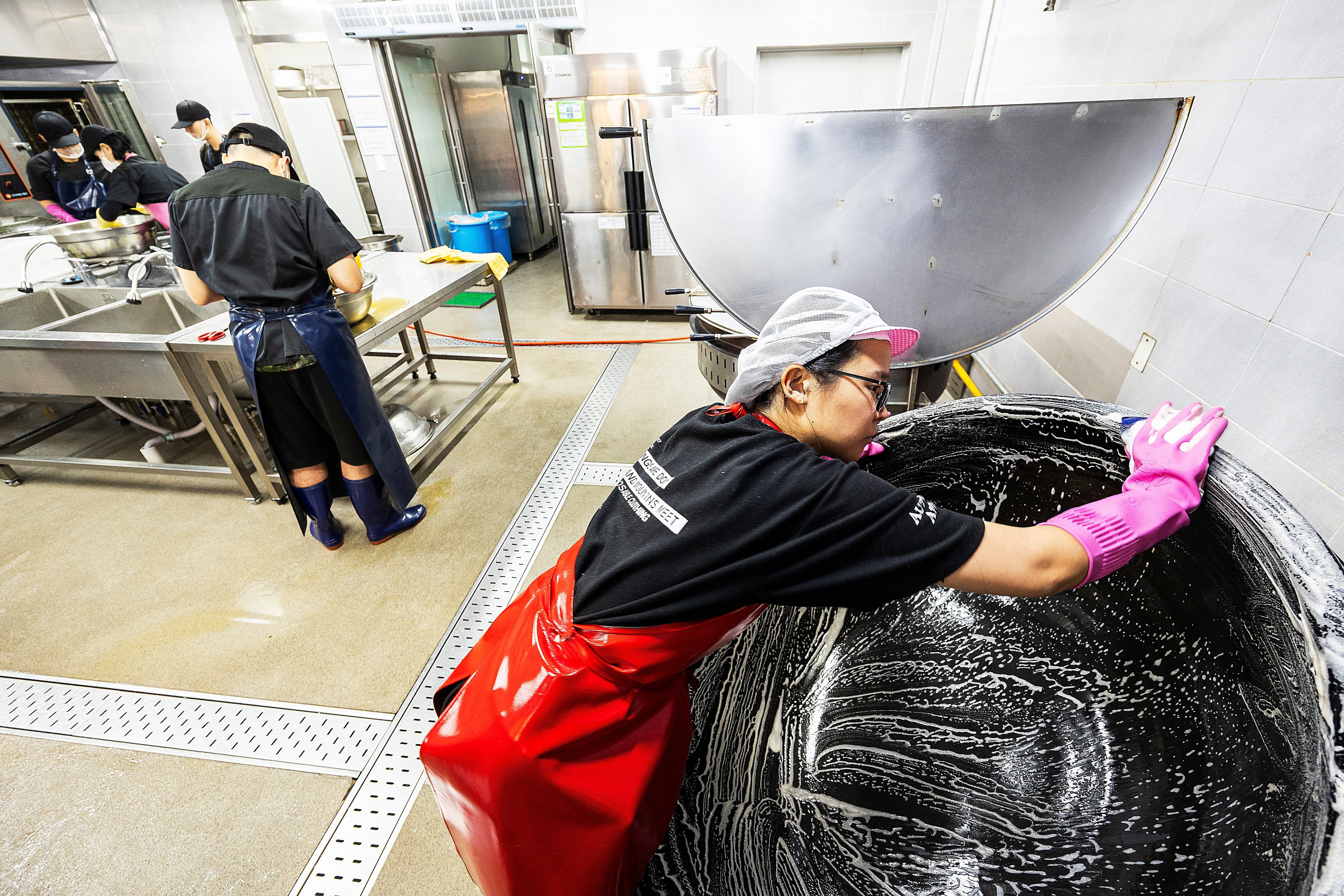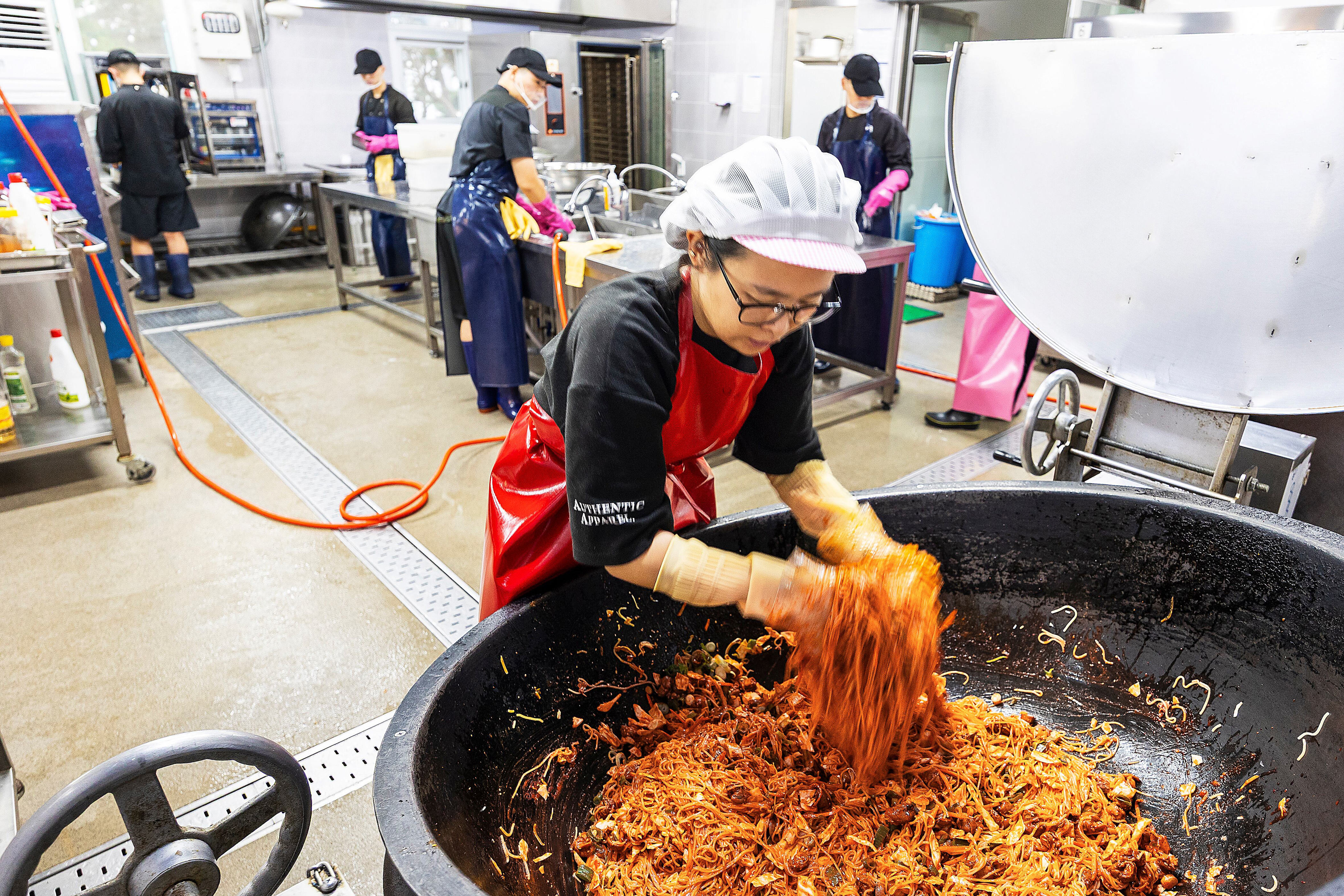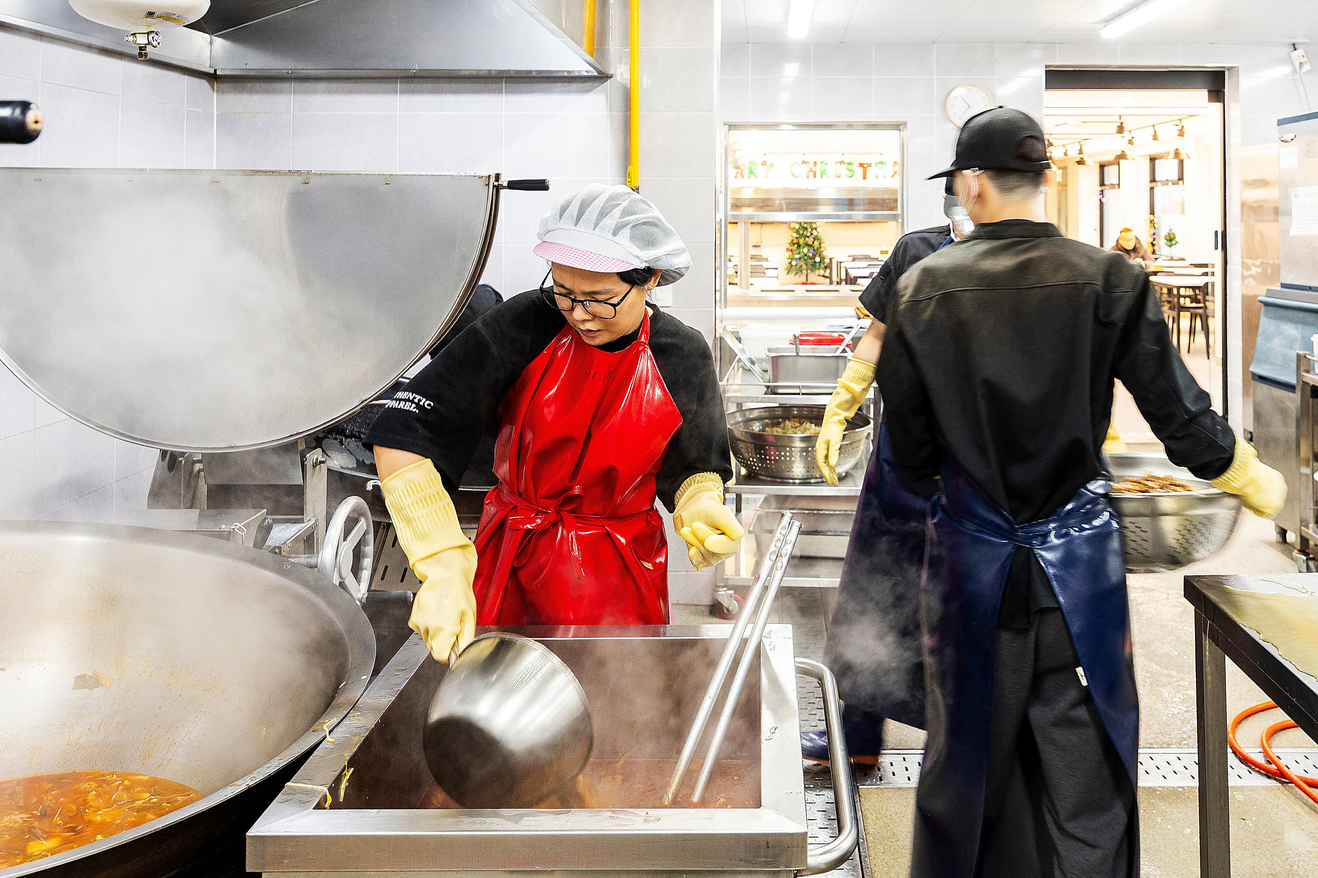 The kitchen was in disarray. Two woks designed for 150 servings hissed on big burners with potatoes, while more than 10 kilograms of pre-made bone broth packages were boiling in a 300-serving soup pot. Before I realized it, I was cutting ham. How did I get into this situation? The chef beside me cut ham twice as quickly as I could manage one slice.