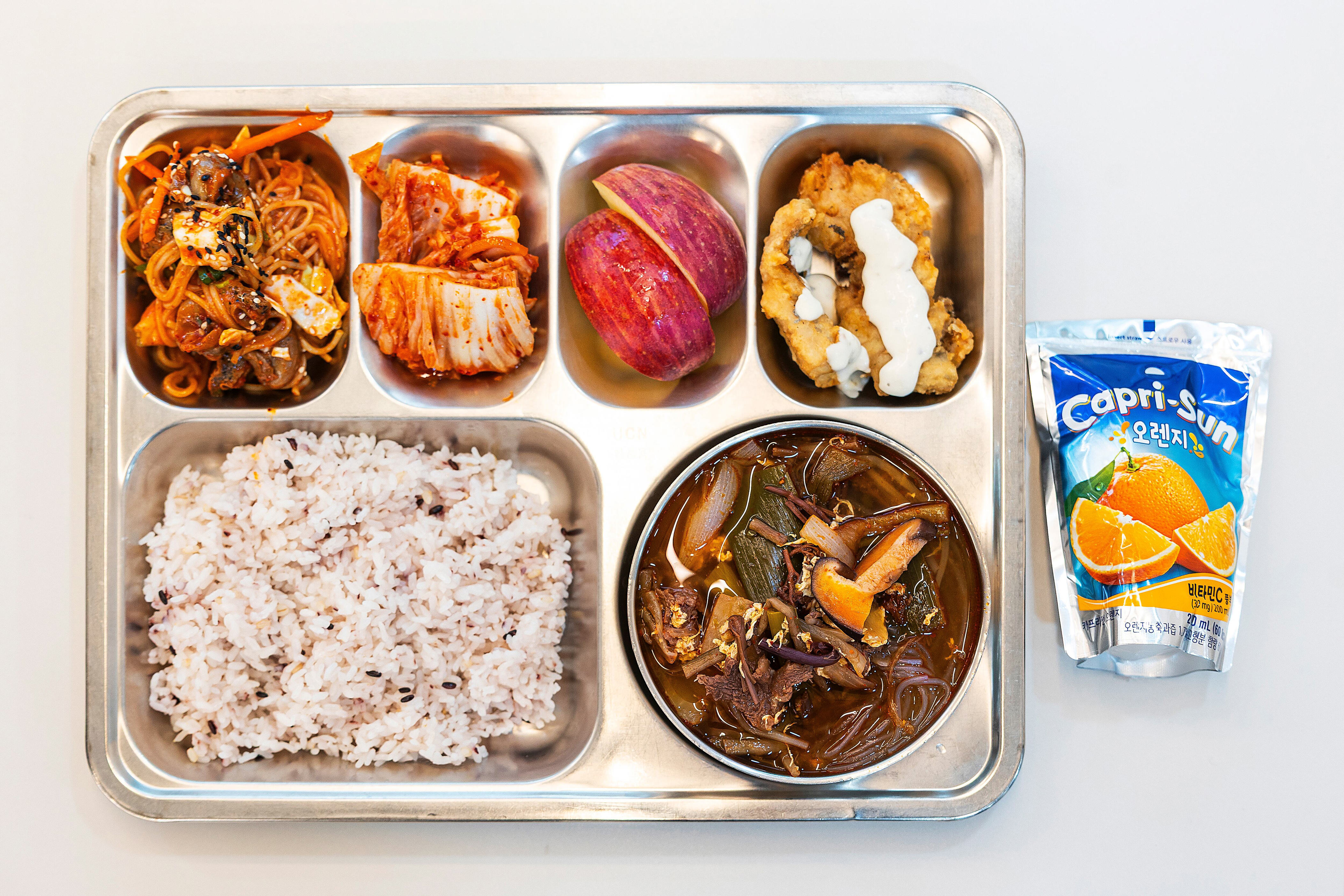 Silent efficiency returned during lunch preparation. The menu included multigrain rice, spicy beef soup, fried mackerel, spicy whelk noodle salad, and Capri Sun orange-mango juice as a treat. Private Park Do-hyun, 21, was responsible for maintaining cleanliness. He continuously sprayed water from a hose, scrubbing big soup pots and woks. Five minutes later, he was cleaning another rotating pot. Cooking and dishwashing occurred at the same time—utensils were cleaned right after use, ensuring no dishes accumulated later. Yellow gloves were used for cooking, while pink ones were for washing dishes. Each time someone forgot to change gloves, the hygiene enforcer would quietly say, “Rubber gloves.”
