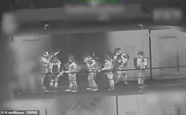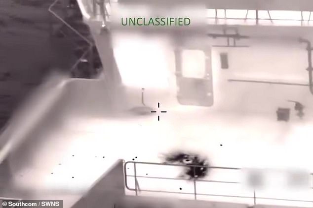 Both the Southern Command and Homeland Security Secretary Kristi Noem shared non-classified videos on social media showing a U.S. helicopter landing on the ship, along with U.S. personnel searching the deck and discarding what looked like an explosive item in front of a door that led into the vessel.