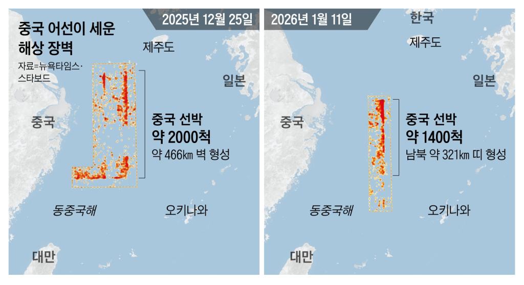 The New York Times examined vessel location data provided by the marine information firm Starboard and noted that on the 11th, roughly 1,400 Chinese ships created a rectangular-shaped line stretching approximately 321 kilometers from north to south in the East China Sea. The arrangement was so thick that some cargo ships were seen taking alternative routes around the “strip” or moving in a zigzag pattern through it. The NYT also mentioned that during last Christmas, more than 2,000 vessels assembled in the same region to create an “L”-shaped “barrier,” with the structure extending 466 kilometers in length at that time.