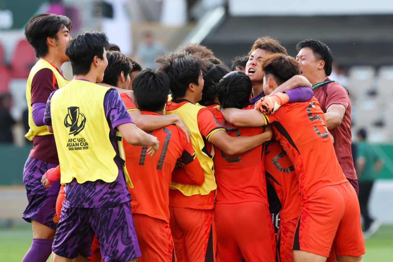 Li Hao and his team members rejoice following China’s 4-2 victory over Uzbekistan in a penalty shootout during the U23 Asian Cup quarterfinals, held at the Prince Abdullah Al Faisal Stadium in Jeddah, Saudi Arabia on January 17, 2026. Photo by AFC |