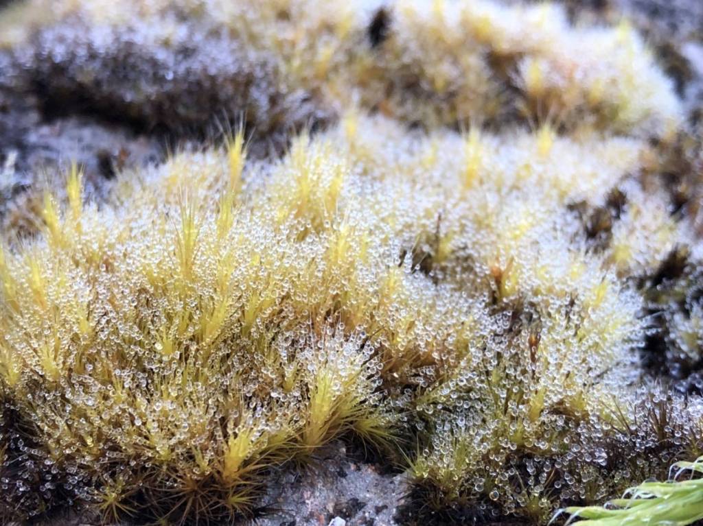 The fragile ice formations on the grass and vegetation form a breathtaking natural display when viewed from a certain angle.