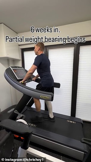 Five weeks into his rehabilitation, he was cycling with both legs on a stationary bike, and a week later he started walking on a treadmill while gradually putting weight on the affected leg.