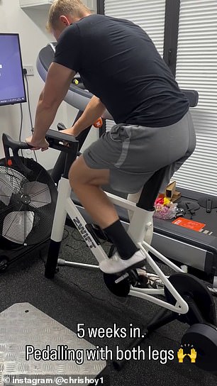 Two weeks after the operation, the six-time Olympic champion was already back on a bicycle, focusing on exercising his left leg while keeping his right leg still on top of some weight plates.