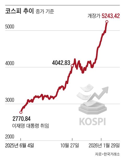 As reported by the Korea Exchange on the 29th, the KOSPI started at 5,243.42, reflecting a 1.4% increase compared to the prior trading day. This was the first instance the index exceeded the 5,200 mark. It achieved this milestone just two trading days after crossing the 5,000 threshold and one day after going beyond the 5,100 level. However, by 9:40 a.m. that day, it had declined 0.31% from the previous trading day, reaching 5,157.74, and fell below the 5,200 level.