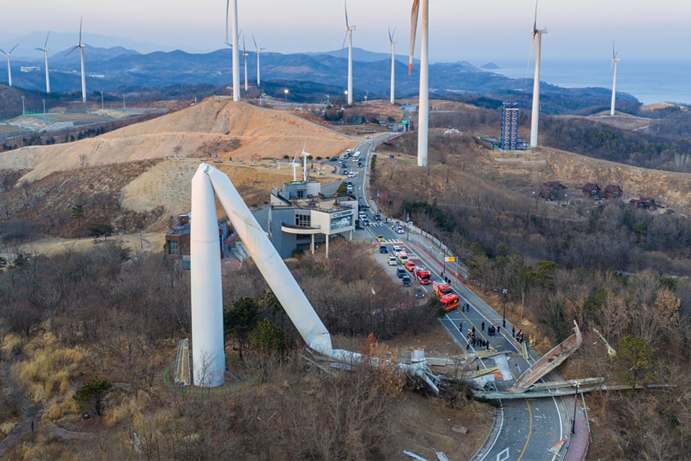 As reported by Yeongdeok County and eyewitnesses, the turbine’s blades were spinning when the support column for the generator unexpectedly broke. It was discovered that debris, including turbine blades, dropped onto the road, almost hitting vehicles that were passing by just moments later, thus preventing a possible catastrophe.
