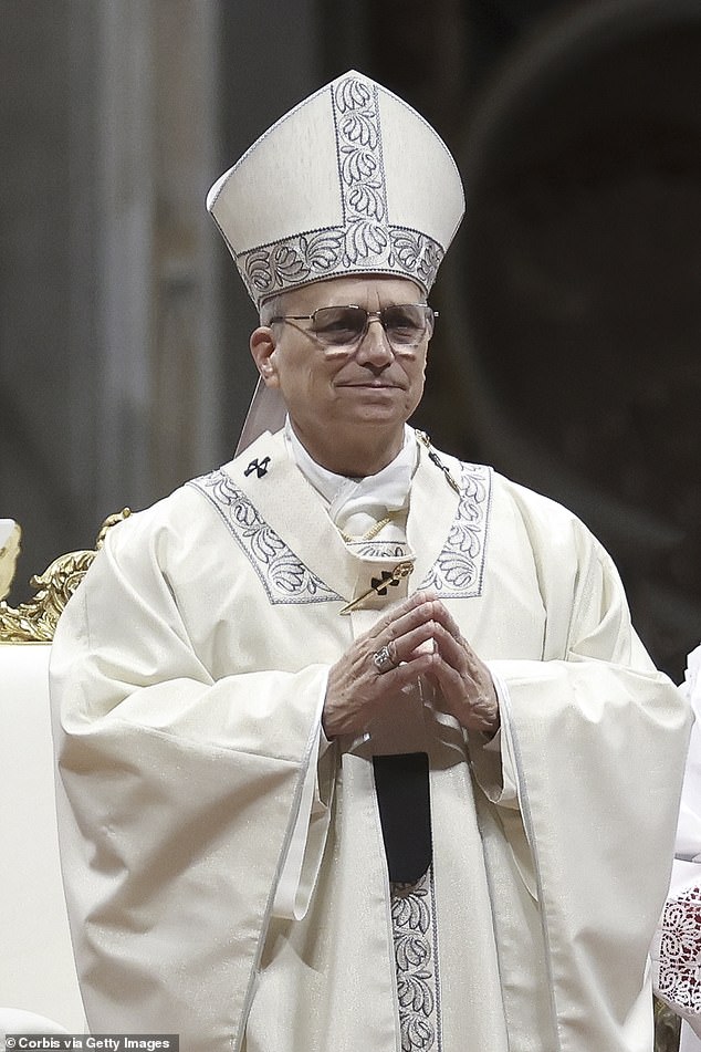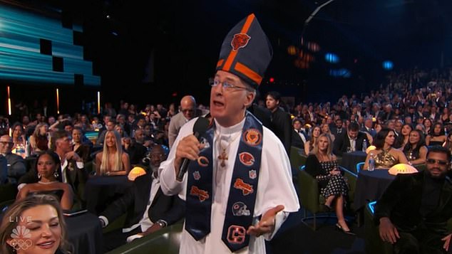 The movie star was interrupted by another actorBob Odenkirk, who was dressed as Pope Leo XIV with a mitre and stole decorated with theChicago Bears logo and patches.
