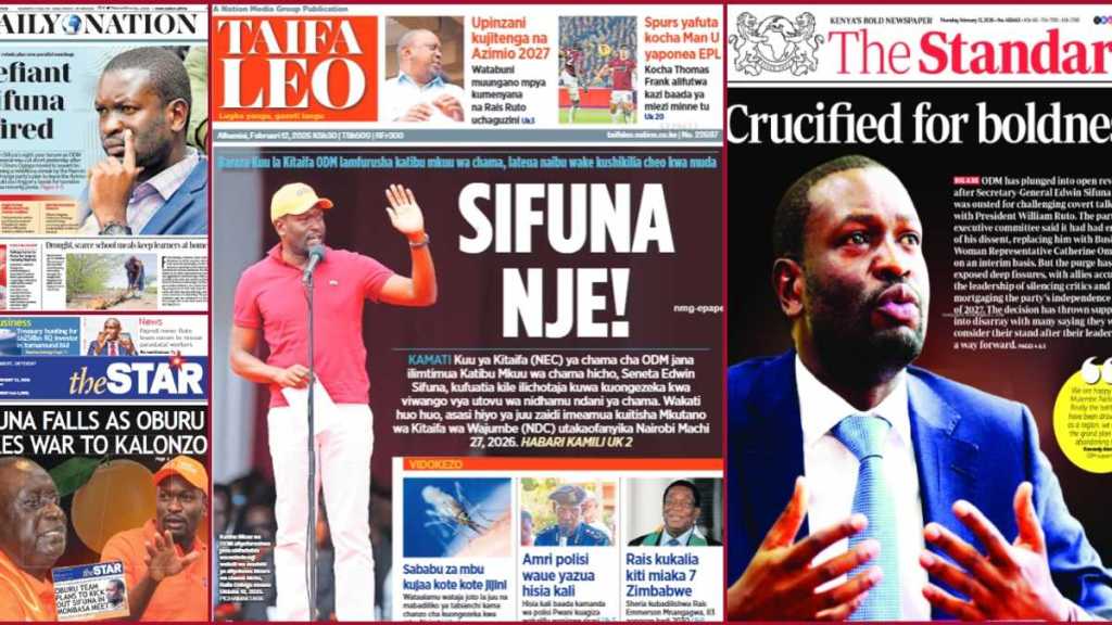 On Friday, February 12, regional newspapers highlighted the removal of Nairobi Senator Edwin Sifuna as ODM’s secretary general following prolonged conflicts with the party’s leadership regarding strategies to collaborate with UDA before the 2027 elections.