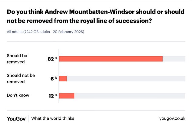 A recent survey this week revealed that 82 percent of Britons now think Andrew should be taken out of the line of succession, with only six percent believing he should stay.