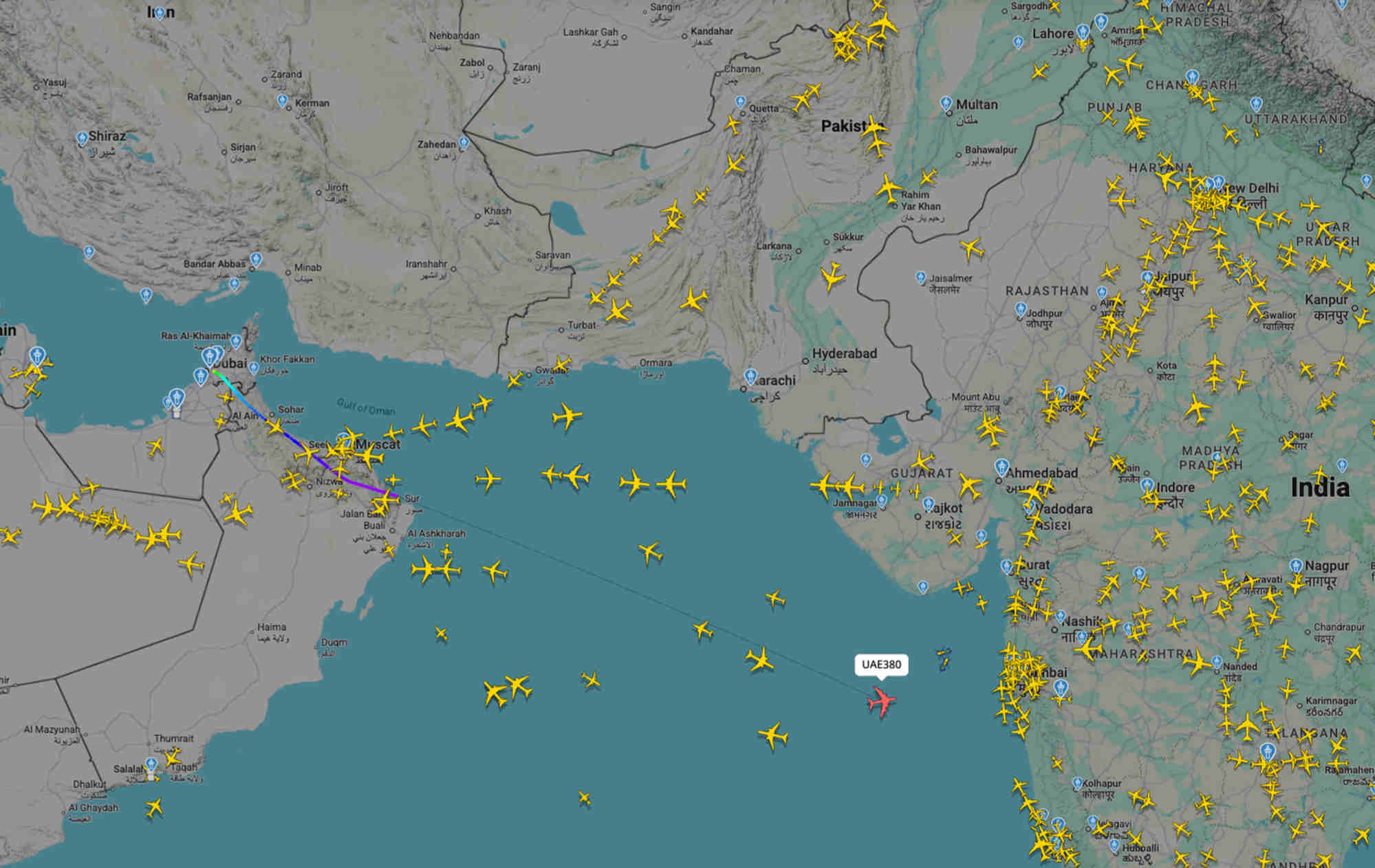 As per the Dubai Airports website, Emirates flight EK380 took off at 10:56 am local time and landed in Hong Kong at 9:50 pm.