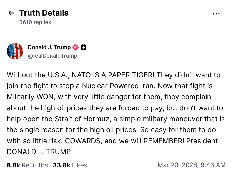 Following the wave of attacks by Israel and Iran on Wednesday, President Trump started to feel anxious. His conflict with Iran has led to a sharp increase in gas prices, making them unaffordable. If these prices keep rising rapidly, the global economy could face serious threats. With Israel posing a threat to the Hormuz Strait, which carries a third of the world’s crude oil, oil prices have surged. Trump has urged his NATO and EU partners to assist the US in securing the Strait, but these allies have declined. On March 18, Trump issued a statement condemning his Western allies, labeling them as weak and timid.