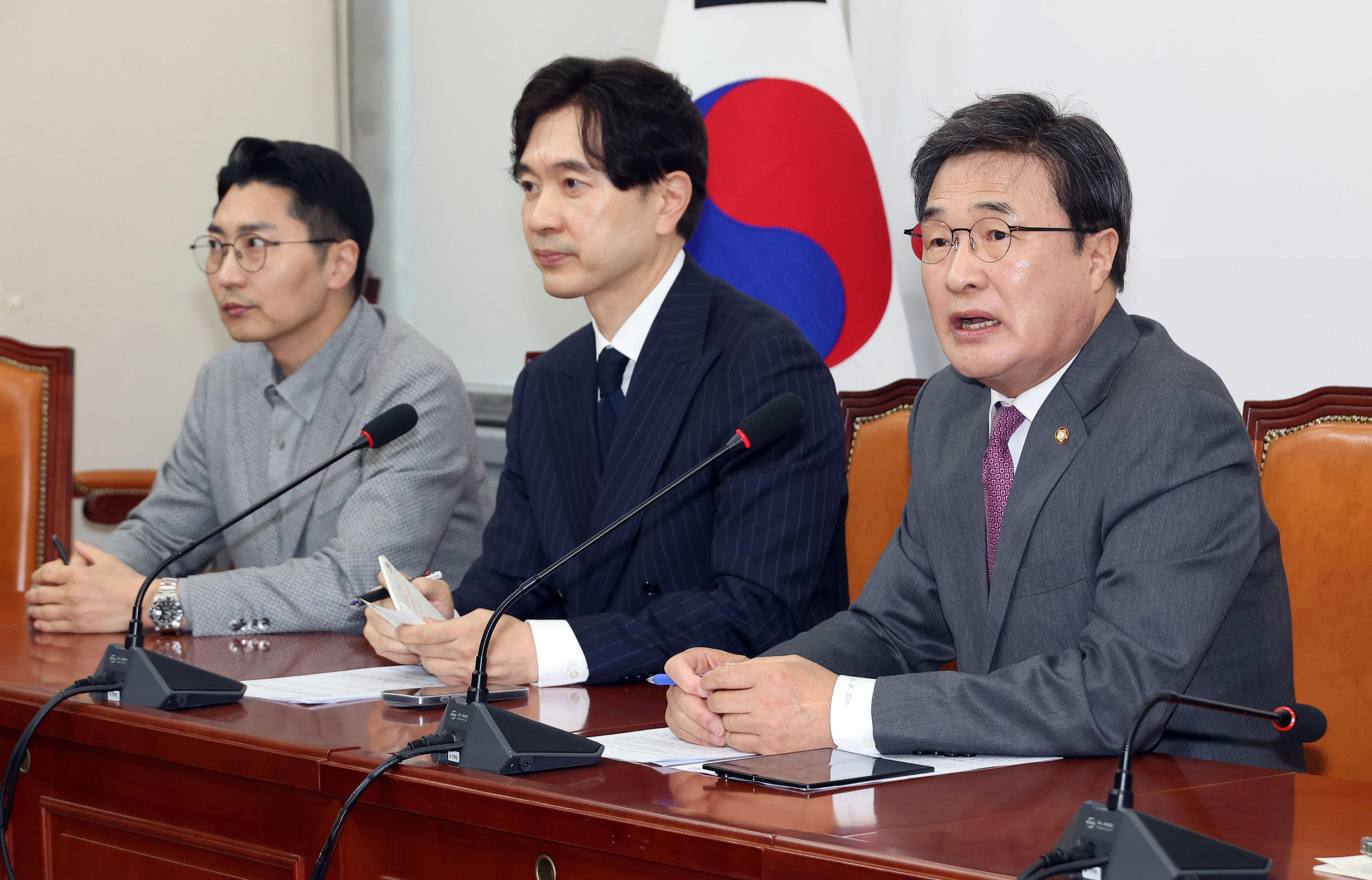 Regarding criticisms from within and outside the party about the timing of Representative Jang’s visit to the U.S., Kim said, “Jun-jun sin-sin bu-bu ja-ja (君君臣臣父父子子), meaning rulers, subjects, fathers, and sons each performing their roles,” adding, “The party leader has their duties, the floor leader has theirs, and the provincial party chairpersons and lawmakers have their responsibilities. The local elections are proceeding smoothly according to the schedule.”