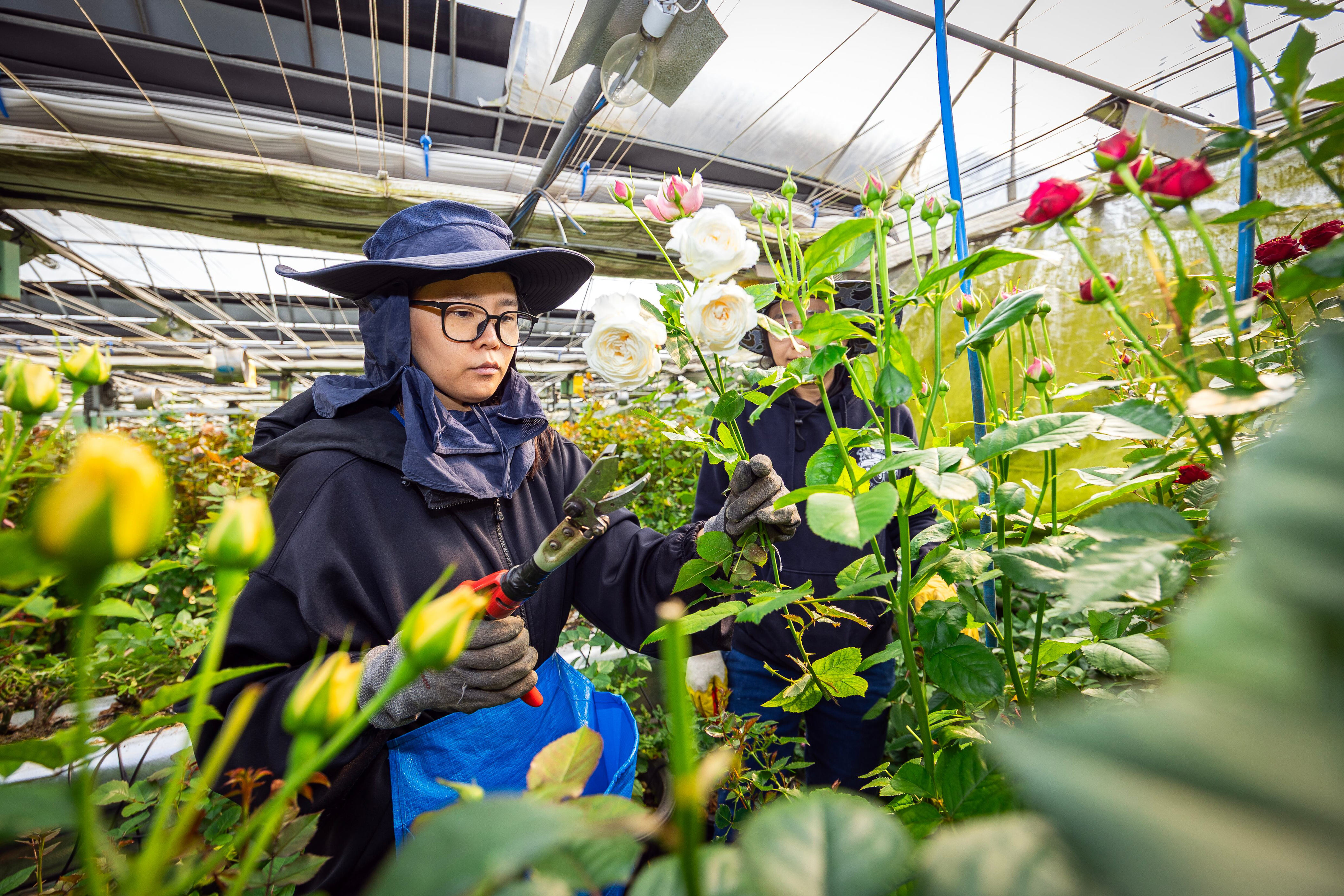 “Positioning is crucial. It influences the next flower stem,” he said. A worker’s expertise is evident here. Thicker stems command better prices as they absorb water and nutrients more effectively. Cutting too high leads to thin, fragile stems; cutting too low slows down new growth. Depending on the season, it takes 35–60 days for the same stem to produce another bloom.