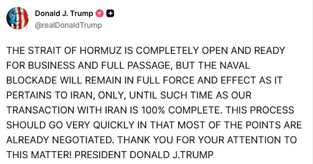 “The Strait of Hormuz is fully open and operational for trade and complete passage, but the naval embargo will continue to be in full effect specifically regarding Iran until our transaction with Iran is entirely finalized. This procedure should proceed very swiftly since most of the terms have already been discussed.” he posted on Truth Social.