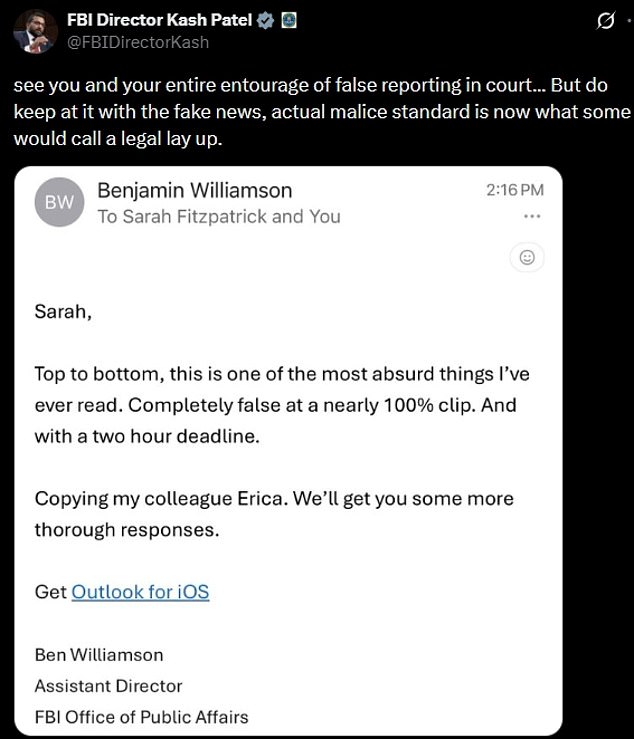 Patel rejected the report as part of a larger media effort targeting him, referring to it as the product of a ‘fake news mafia’ and asserting that these attacks prove the FBI is performing its duties well.