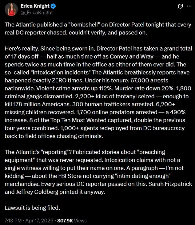 “Here’s the truth. Since taking office, Director Patel has only taken 17 days off—half the amount of time off that Comey and Wray received—and he spends twice as much time at the office as either of them did,” Knight wrote.