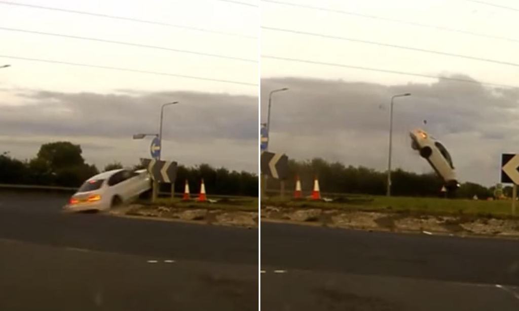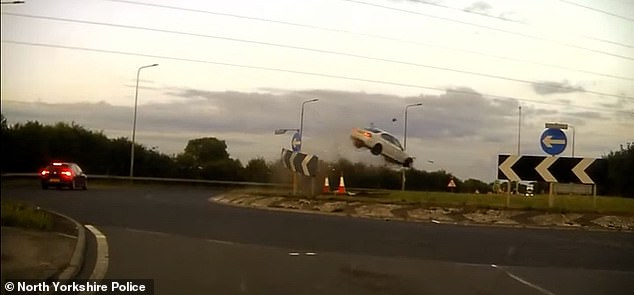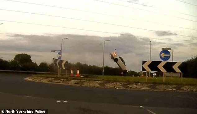 The driver was unable to come to a stop, speeding up to 130mph on the A64 before crashing into the roundabout and lifting off the ground.
