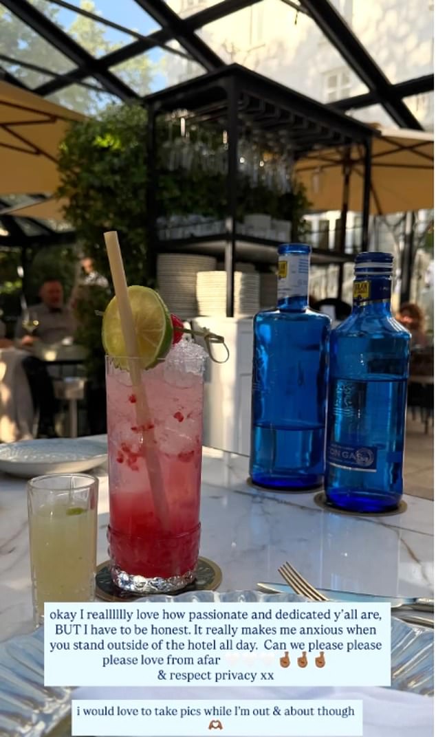 “Okay, I really love how passionate and dedicated you all are, BUT I have to be honest. It really makes me anxious when you stand outside the hotel all day. Can we please, please, please show your love from a distance and respect privacy xx,” she wrote on Sunday.